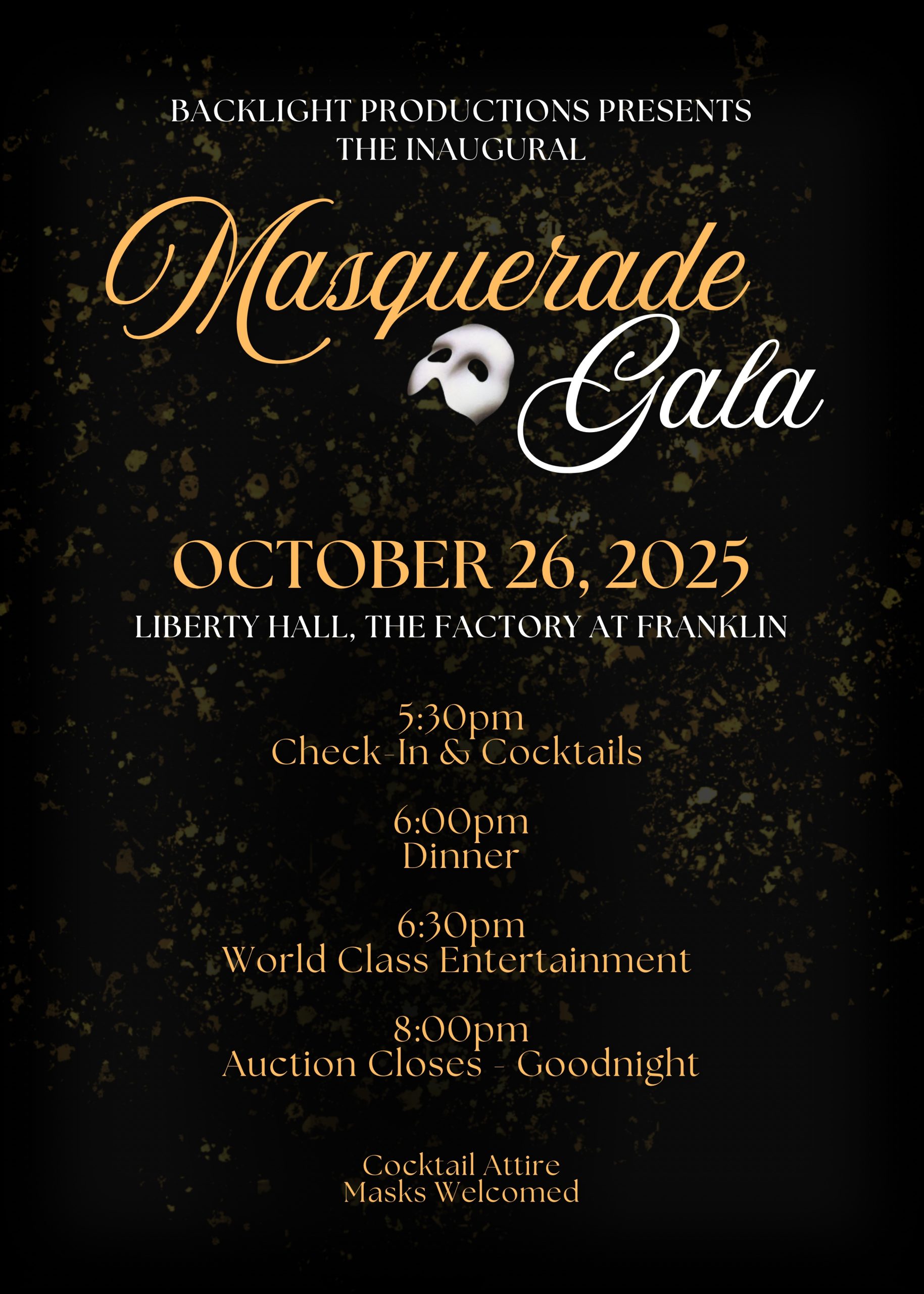 You are cordially invited to Backlight Productions’ first ever gala fundraising event! Join us for a spell-binding, Phantom of the Opera-themed Masquerade Ball, highlighting the greatest hits of Backlight shows from the past and casting the vision for the future! The evening will include dinner, drinks, a silent auction and world-class entertainment featuring Broadway and local professionals (including two time Tony Award nominee Laura Osnes) and all your favorite Backlight artists!Â